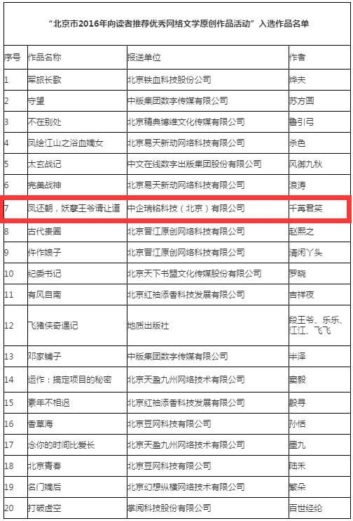 (原标题:20部小说入选北京市2016年优秀网络文学原创作品)