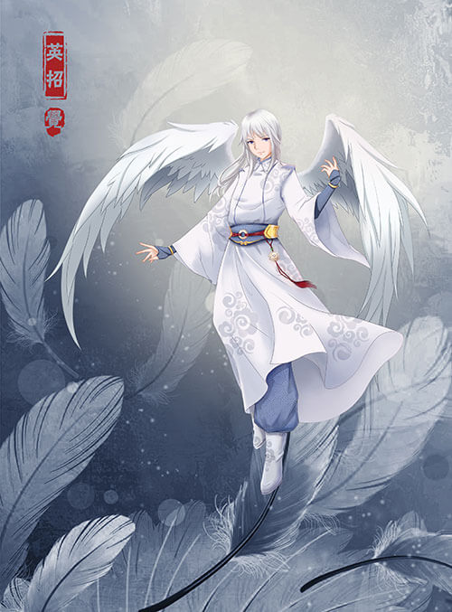如文言,《山海经》中英招的是马身人面,虎纹鸟翅的形象。但在在《六合青山卷》中英招的形象却是白衣如雪,长发紫瞳,在飞的时候才会生出对翅的俊俏少年。