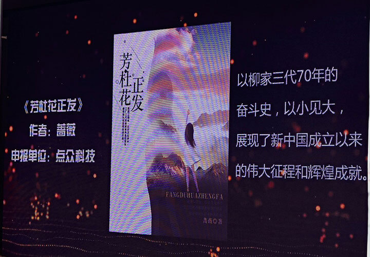 本次获奖的作品《芳杜花正发》是以改革开放为背景的小人物的奋斗故事,本文以共和国同龄者柳溪的个人奋斗为主线,以其工作的国企为缩影,以现实主义笔法刻画了一批有理想、有原则、有干劲的共和国奋斗者群像,洞幽察微,以小见大,宣传了共和国七十年的辉煌成就,有较强的激励作用和示范意义。本书情节紧凑,人物鲜活,语言精彩,具有较高的作品价值。