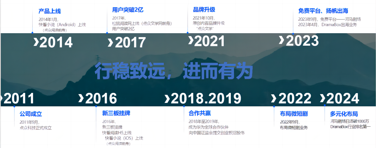 2011年9月—2022年9月,公司重点发展网络文学业 务。在运营模式上,采用客户端、微信H5、快应用等多重产 品矩阵。2014年1月,快看小说(Android)上线,作为点 众阅读前身,开启内容服务征程。2016年,公司新三板挂牌, 快看阅读H5及快看小说(iOS)上线,拓展业务布局。在H5 业务模式中拥有千万日活,覆盖6亿用户,位于行业第二地 位。2017年,松鼠阅读网上线(点众文学网前身),用户规 模突破2亿。2018-2019年,成为华为全球合作伙伴,并向 中国证监会提交创业板招股书,深化合作与资本探索。 2021年10月,为强化品牌建设,公司原创内容品牌升 级为“点众文学”。“点众文学”围绕数字阅读,不断丰富 内容品类,扩大内容储备。独创以内容获取用户的“书找人” 运营模式和“头部书”运营策略,孵化了诸多受用户喜爱的 爆款作品;许多单本书的营收过亿,最高达到近4亿的充值 收入,获得80%的用户主动付费。与此同时,在精品IP打造 方面发力,探索IP衍生运营新模式。